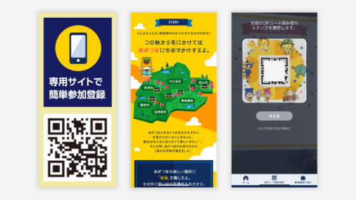 各施設に設置されたQRコードを読み取り、スタンプの獲得から応募までスマートフォン内にて完結。ICTを活用し、非接触によるイベント運営を実現した。