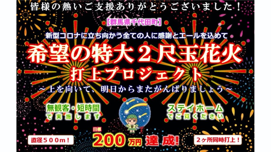 【群馬県千代田町】希望の特大2尺玉花火2か所同時打上プロジェクト!クラウドファンディング目標額200万円達成!