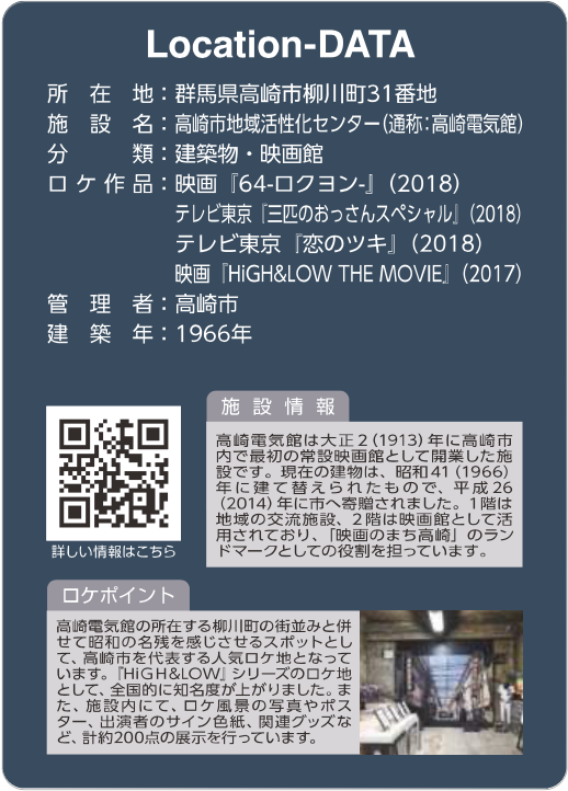 高崎市と前橋市では、4月11日から映画やテレビ番組のロケ地を紹介する「ロケ地カード」の配布が始まった。今回の取り組みは、北関東中核都市連携事業の一環として行われ、映画「64(ロクヨン)」や「HIGHT&LOW THE MOVIE」などの映画、多くのテレビドラマなどでロケ地として使われている「高崎市地域活性化センター(高崎電気館)」、「今日から俺は!! 劇場版」や「バナナマンのせっかくグルメ」などのCMや映画・ドラマのロケに登場している「前橋中央通り商店街」などが紹介されている。