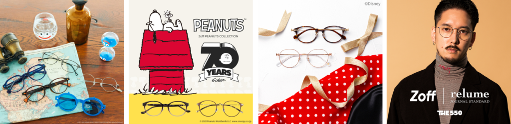 根強い人気を誇る「Disney Collection」、「Zoff PEANUTS COLLECTION」などのディズニーやスヌーピーなどキャラクターをモチーフにしたコレクションに加え、人気ファッションモデルがプロデュースした「Zoff CLASSIC ROMANTIC LADY」、人気ファッションブランド JOURNAL STANDARD(ジャーナルスタンダード)とのコラボシリーズ「Zoff×JOURNAL STANDARD relume」など、トレンドを抑えたアイウェアもご用意。
