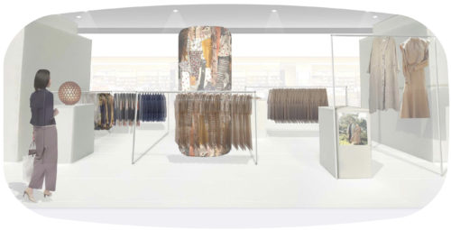 生産時にでる残布やハギレをアップサイクルした試着室を中心に、それに呼応するように什器を「一筆書き」に構成。経と緯を意識した「線」による空間をお楽しみください。
