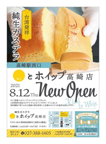 2021年8月12日、群馬県高崎市にオープンすることが決まった「キミとホイップ 高崎店は、名前の通り、キミ(卵黄)とホイップ(メレンゲ)にこだわった純生カステラ専門店です。