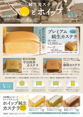 また「プレミアム純生カステラ」の他にも、人気商品が多数揃っており、 近日発売予定の自家製カスタードホイップが入った「ホイップ純生カステラ」もぜひ チェックしてみてください!