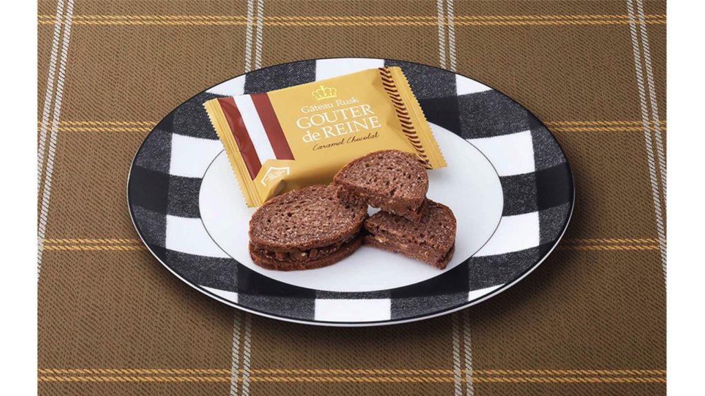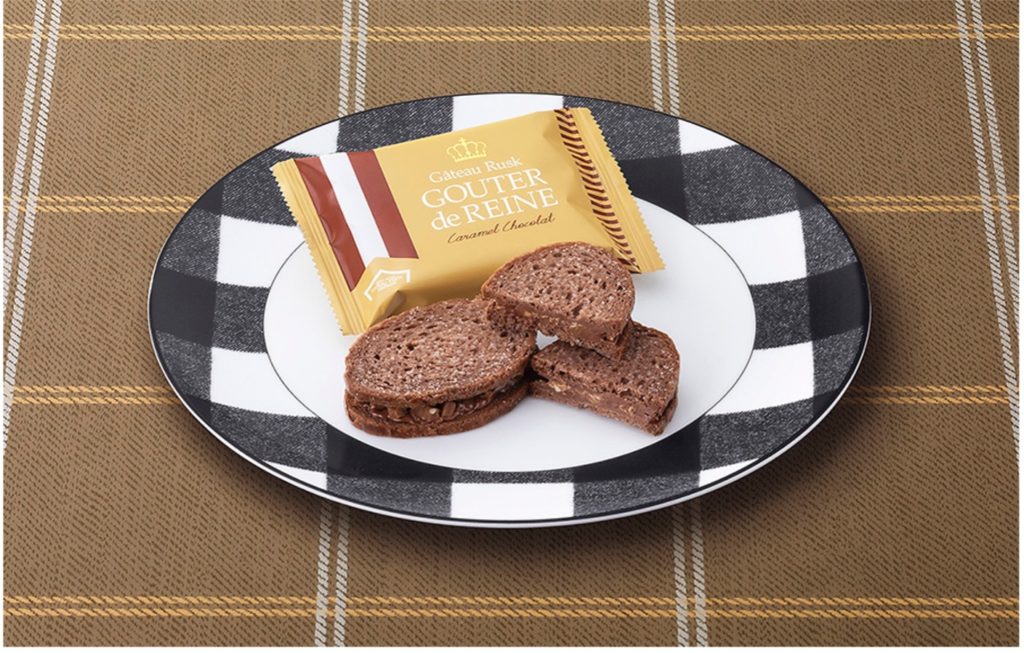 「グーテ・デ・レーヌ キャラメルショコラ」は、薄くスライスしたココア風味の繊細なガトーラスクで、チョコレートクリームとアーモンド入りのキャラメルフレークを挟んだお菓子。