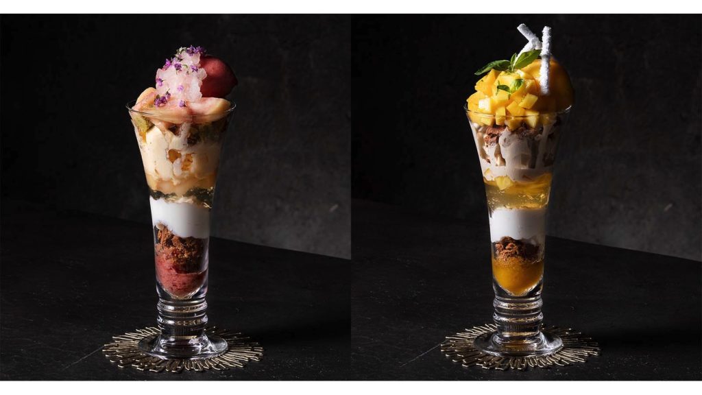 第一弾としてお届けするのは「夏の贅沢フルーツパフェ」で、瑞々しい桃やマンゴーをたっぷりあしらった「桃とすもものメルバパフェ」と「マンゴーとココナッツのアールグレイなパフェ」です。