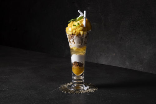 なめらかな口当たりのマンゴー、ふんわり盛られた自家製アールグレイジェラート、ジャスミンジュレ、ココナッツムースやパイナップル、パッションフルーツの酸味などがひとつの器に絶妙なバランスを成しています。食感を楽しむクランブルのクッキーも飾りのココナツ味のメレンゲのロールスティックもザ・パティスリーの小さな工房製。仕上げには爽やかさを演出するマイクロバジルを添えました。