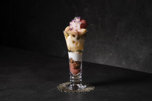 トッピングに桃のグラニテと花穂じそも飾りました。一口食べるごとにフルーツの多様な味、食感を楽しめる、至福のときをもたらす期間限定パフェです。