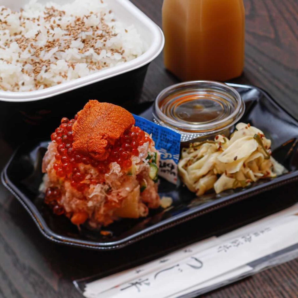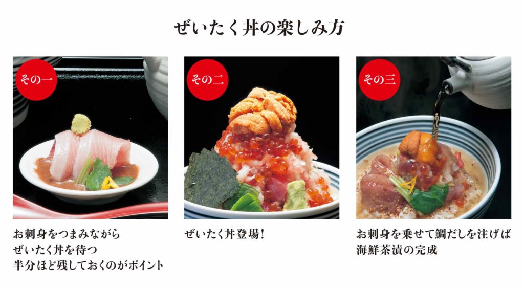 つじ半の看板メニューと言えば「ぜいたく丼」。見た目の華やかさやふんだんにつかった海鮮の魅力が多くの人に「食べてみたい!」と思わせる一杯となっています。しかも驚くべきはその楽しみ方!なんと、この海鮮丼「一杯で三度美味しい」海鮮丼なんです!