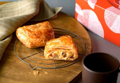 3、オリジナルの64層のパイ生地は軽やかでサクサクとした食感を追求。中身のリンゴやカスタードを1つにまとめ、美味しさを閉じ込めました。