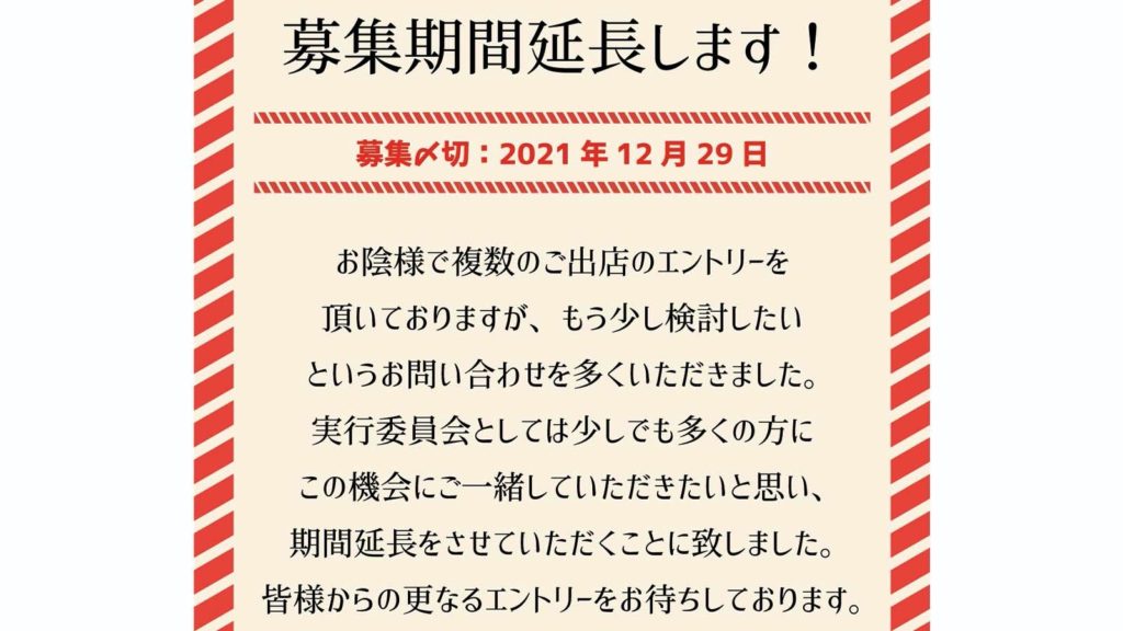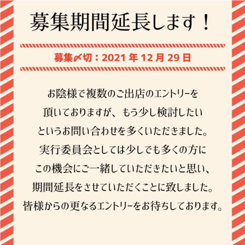 実行委員会としては、少しでも多くの方にこの機会をご一緒していただきたいと思い、出店エントリーの募集期間を延長させていただくことに致しました。