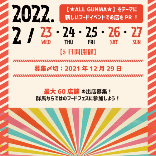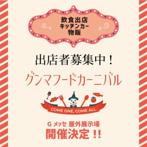 只今、群馬県内の飲食店・物販事業者・キッチンカー事業者に限定し、『グンマフードカーニバル2022』を一緒に盛り上げていただける出店者様を募っております。