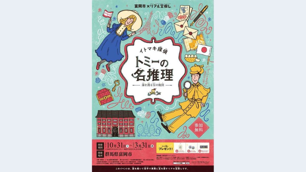 体験型コンテンツ「リアル宝探し」の企画・制作・運営を手がけている株式会社タカラッシュ(本社:東京都江東区、代表取締役:齊藤 多可志)と富岡市は10月31日(土)から、リアル宝探しイベント『イトマキ探偵トミーの名推理~海を渡る宝の地図~』を開催。富岡市でのリアル宝探し開催は昨年に引き続いて2年目となります。