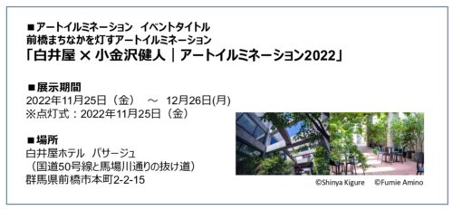 前橋のアートデスティネーション「白井屋ホテル」(2020年12月開業)を運営する白井屋ホテル株式会社(群馬県前橋市本町、代表取締役:矢村功)は、「前橋のまちなかをアートで明るく灯したい!」という思いでホテルの1周年を記念し、昨年2021年12月に鬼頭健吾氏の作品を展示し、白井屋アートイルミネーションをスタート。