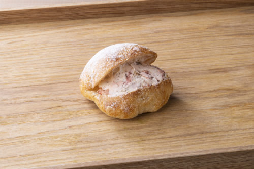 北海道根釧地区の生乳を使用したクリームチーズにドライフィグとフリーズドライのイチゴを合わせたデザート感覚のサンドです。4種の小麦を調合したバゲット生地を軽めに焼いて、パリッと感と甘味と酸味、そしてコクのあるクリームのハーモニーが楽しめます。ヒュッテハヤシの生ハムなどとも相性が抜群です。