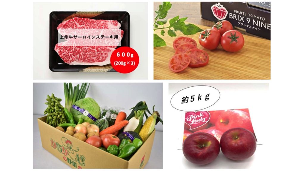 ぐんまが誇る糖度9度以上の高糖度トマト「ブリックスナイン」や、ほどよい脂質と旨味に秀でた肉質の「上州牛サーロインステーキ」、群馬県最大の農産物直売所「からか~ぜ」の店長が厳選した旬の野菜が届く「からか~ぜ店長セレクト!野菜ボックス」など、対象の商品は100商品以上あります。