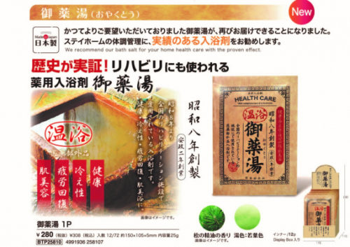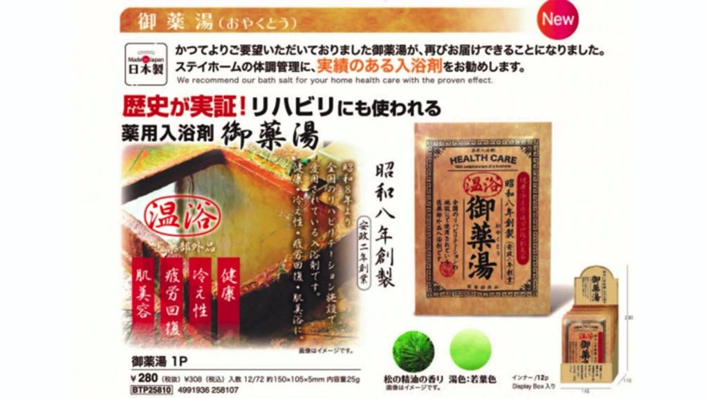 今回ご紹介する「御薬湯(おやくとう)」は、昭和8年より全国のリハビリテーション施設で愛用されている入浴剤です。