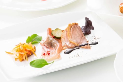 料理の提供方法も、個々盛りはもちろんのこと、一皿に数品のお料理をまとめて盛り付け、種類は減らすことなくお客さまとの接触時間を短くするなど一工夫。ソーシャルディスタンスが取れるゆったりした会場で、飛沫防止パネルの設置、空気循環システムによる換気等、ホテルならではの感染対策を施した安心できる空間を提供しています。