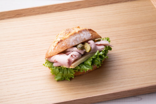 ヒュッテハヤシさんに特別に作っていただいたジャンボンブラン(ボイル仕上げの豚もも肉のハム)を贅沢にサンドしました。自慢の国産小麦のバゲットも形を変え、定番サンドイッチをアップグレードしました。旨味たっぷりのハムと分厚い上質なバターを合わせた食べ応えのある贅沢なサンドイッチです。