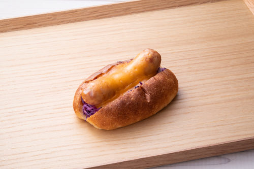 前橋市の人気シャルキュトリ、ヒュッテハヤシさんのパリッとした食感とジューシーな肉の旨味が楽しめるボリューム感たっぷりの手作り粗挽きソーセージ、シャキシャキの紫キャベツ、プチプチした食感がクセになるマスタード、チェダーチーズを、マッシュポテトを練り込んだもっちりしたホットドッグ生地に挟みました。シンプルな構成ながら素材にこだわった白井屋ザ・ベーカリーの頭文字を冠したホットドッグです。