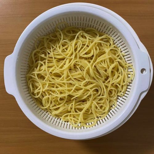 ⑦茹で上がったら、ザルにあけて流水でぬめりを洗い流し、水気をしっかりと取る。
