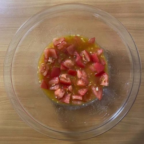 ③ボウルにトマト・にんにく・オリーブオイルを入れ、とろりとするまで混ぜる。