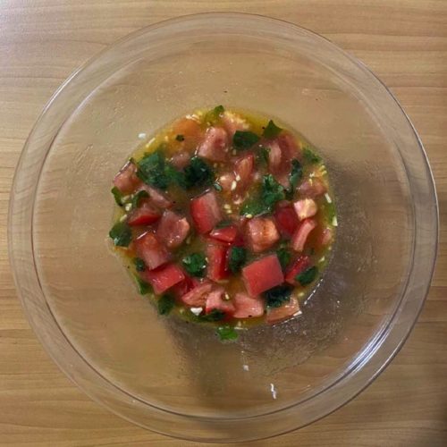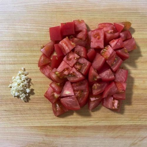 ①トマトは洗って水気を除き1cmの角切りにする。
