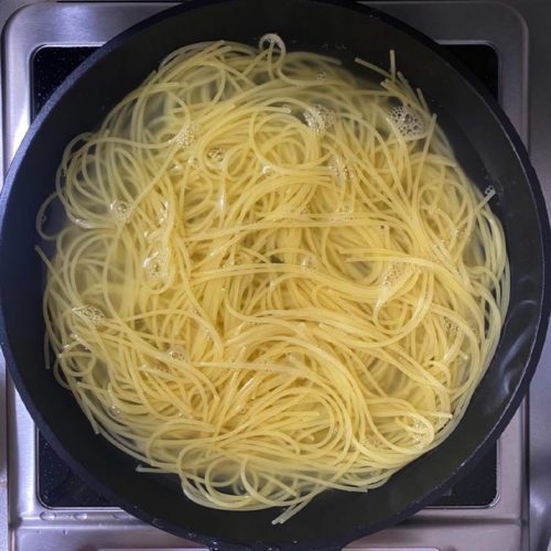 ⑥鍋にお湯を沸かし、塩を加えてパスタを表示時間通り茹でる。