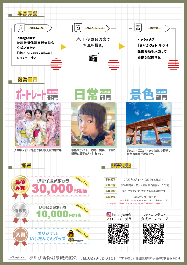 群馬県渋川市の渋川伊香保温泉観光協会の企画「しぶかわいかほフォトコンテスト」では、渋川市内(伊香保温泉含む)にて撮影し、指定のタグ付けを行い、instagram(インスタグラム)上に投稿された写真を対象として、「ポートレート」「日常」「景色」の3部門を設け、フォトコンテストを開催。