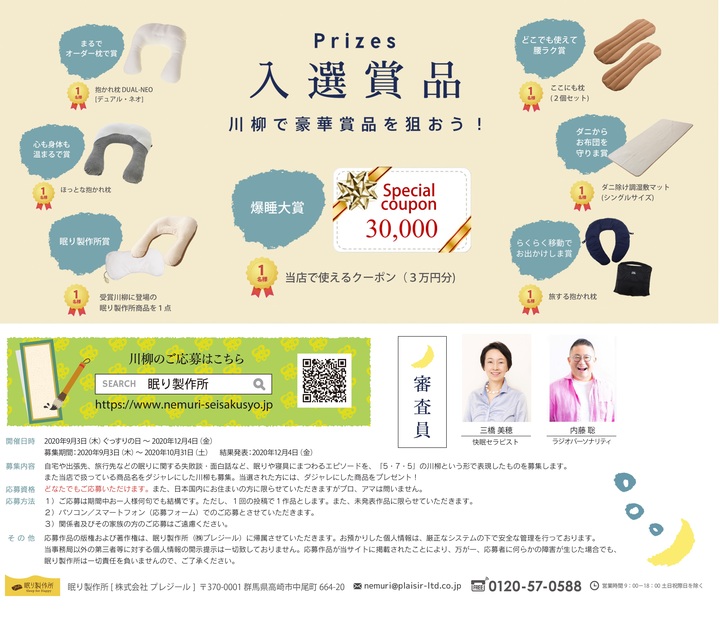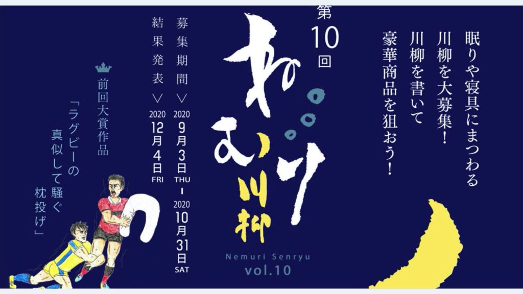 特に今年はコロナ禍で寝付けない、眠れないという方も増えています。そんな緊張した時だからこそ一服の清涼剤として気持ちを和らげるためにもどうイベントを開催。昨年はラグビーワールドカップを題材にした川柳が多かったように思います。ご自身のことでも、ご家族のことでも、「眠り製作所」の商品のことでも、どんなネタでも構いません。眠りについての失敗談やおもしろいエピソード、ほっと安らぐ体験など、皆様のユーモアあふれる作品を募集しています。