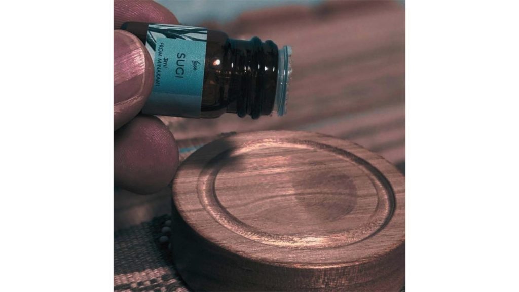 自伐型林業チームの一員として森を整備し、その際に出る間伐材の枝葉を原料に天然100%のアロマオイルを製造しています。谷川山系から湧き出る清水と間伐材の枝葉、薪のみを使用し自然の力のみで抽出した香りを用い、アロマ商品の開発・販売等をおこなっています。モノづくりにおいて、森の循環、四季の巡りの中から生まれる香りで人と自然がつながれるような商品づくりを心掛けています。スギ、ヒノキ、アカマツ、モミ、アブラチャンなど木系の香りが中心。好きな場所で香りを楽しんでもらえるよう、木製オリジナルアロマディッシュもセットで販売しています。