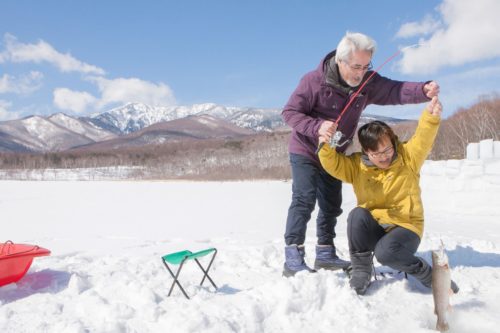 氷上からは、日本百名山の四阿山を始めとした雪山と青空のパノラマが広がり、カナダや北欧の湖で釣りをしているような気分にさせてくれます。竿やエサはもちろん、お二人で入る事が出来る風防テントのレンタルもございます。休暇村からバラギ湖までは車で約30分です。
