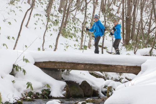 雪の上を歩くための道具「スノーシュー」を履いて、鹿沢の森に出かけます。特別な技術がなくても気軽にハイキングが出来るため、スキーやスノーボードが苦手な方も、冬の大自然を楽しむことができる人気のアクティビティです。フワフワの雪の上を歩いたり、動物たちの痕跡を探したり。お天気が良ければ、嬬恋村や浅間山を一望する、標高1746メートルの村上山山頂を目指します。ガイドが同行しますので、初心者の方も安心です。