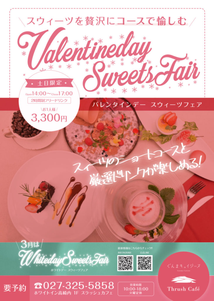 結婚式場ホワイトイン高崎の1階にあるレストラン「スラッシュカフェ」 では、2月と3月の期間限定で、「苺とチョコづくしのデザートコース」などデザートのコースと、フレーバーティーやノンアルコールカクテルなど豊富なドリンクが2時間制で飲み放題という贅沢で至福なひとときを楽しめるスウィーツフェアを開催中。