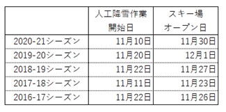 過去5年間の人工降雪作業開始日とスキー場オープン日