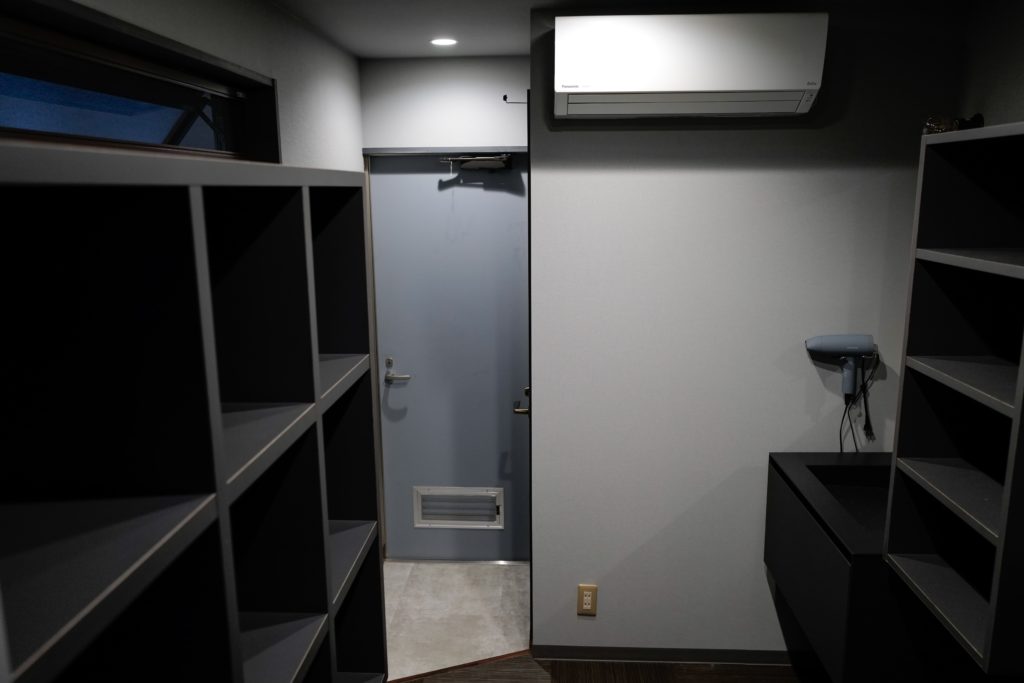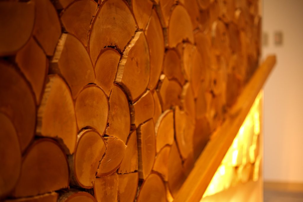 HARVIA社製のサウナストーブLEGEND300を設置し、天井は蒸気がまわりこみやすいアール設計。蒸気の対流をダイレクトに感じる天井高1.1mの座面に腰を掛け、壁からの輻射熱と薪き火のやわらかい熱があなたを包み込みます。