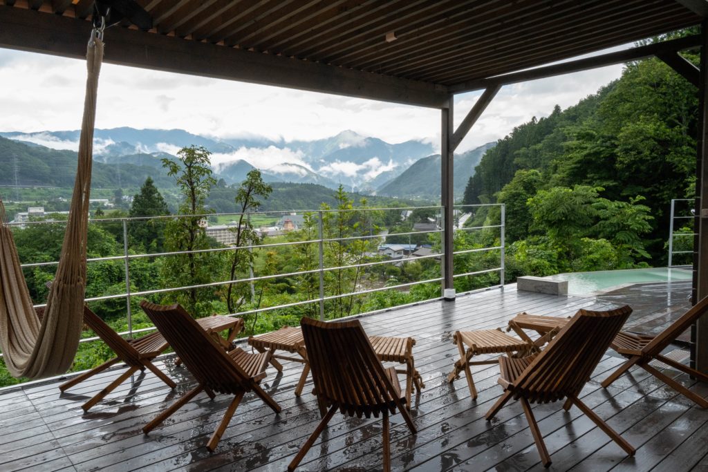 カラ松の大きなテーブルを囲んで話せるリビングスペースや男女別の寝室、谷川岳を一望できる屋根付きウッドデッキ、焚き火を囲めるファイヤーピット付きの貸切りコテージに宿泊いただけます。