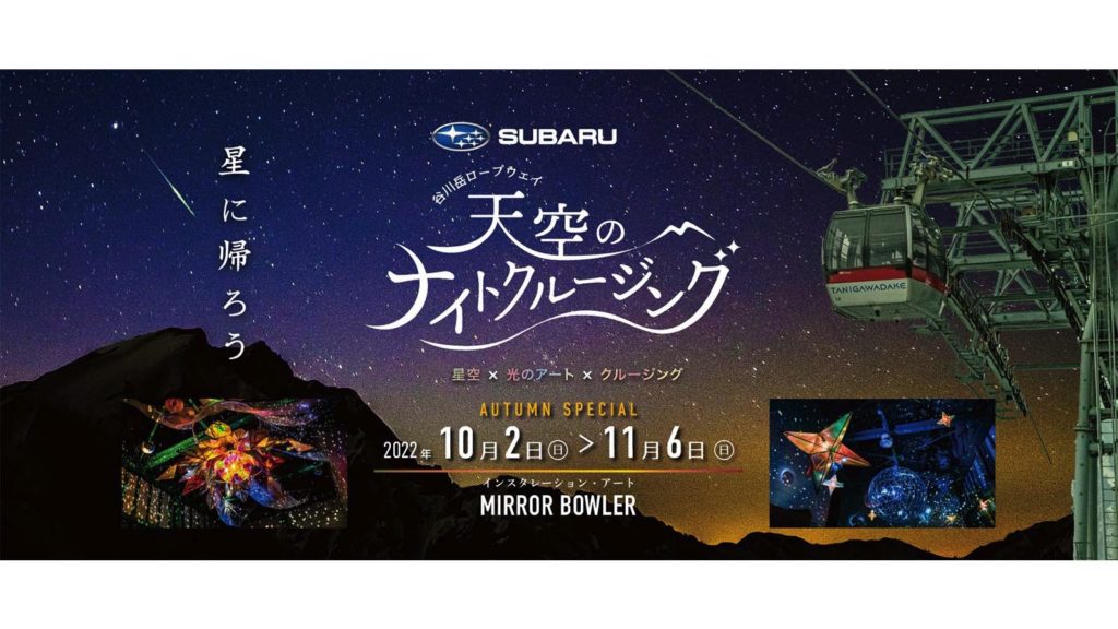 一般社団法人みなかみ町観光協会が主催する、谷川岳天神平ロープウェイ『天空のナイトクルージング』(協賛:株式会社SUBARU)は、今秋2022年10月2日(日)~11月6日(日)全13回の開催を決定。