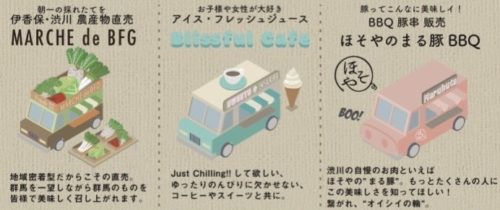④お子様や女性が大好きなアイス・フレッシュジュースなどが楽しめる「Blissful Cafe」、伊香保・渋川の農産物を直売、群馬ブランド「ほそやのまる豚」のBBQ豚串、などが楽しめるキッチンカーをご用意します。
